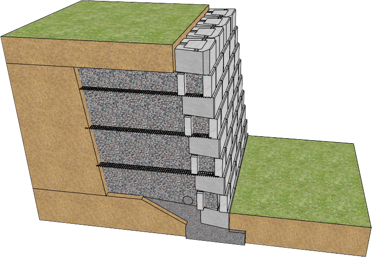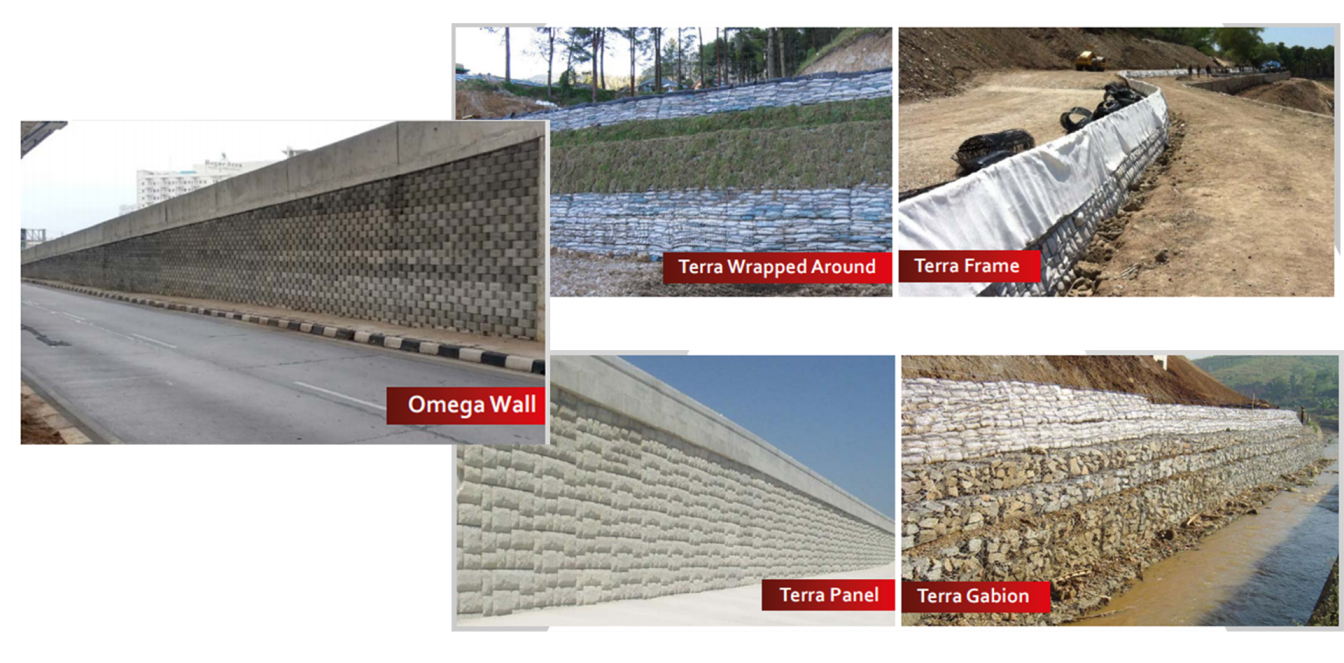 Omega Wall adalah dinding vertikal yang merupakan susunan Modular Block disusun secara terintegrasi (interlocking) satu dengan lainnya dan dikombinasikan dengan Geogrid dan lapisan material yang dipadatkan.